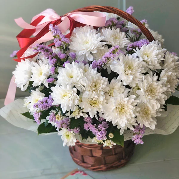 Безупречная красота - корзина с кустовой хризантемой и статицей