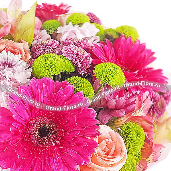 Стандартный: гербера малиновая - 5 шт., роза розовая - 3 шт., хризантема розовая - 3 шт., хризантема зеленая (сантини) - 2 шт., альстромерия - 2 шт., фетр розовый, бант розовый.