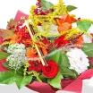 Уменьшенный: гербера оранжевая - 2 шт., роза красная (50 см) - 3 шт., хризантема одноголовая белая - 1 шт., очиток - 2 шт., фезалис - 1 шт., салал - 2 шт., солидаго - 2 шт., гиперикум - 1 шт., фетр бордовый, карандаши 4 шт., лента красная.