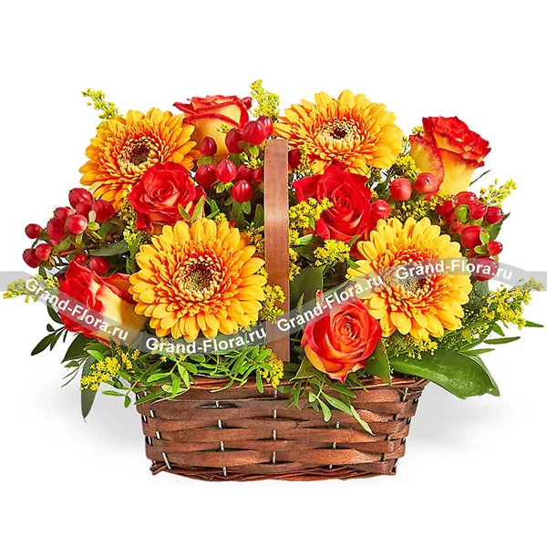 Уменьшенный: роза оранжевая - 3 шт., гербера оранжевая - 4 шт., гиперикум - 2 шт., декоративная зелень, оазис, корзина малая.