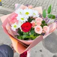 роза красная - 1 шт., роза розовая - 2 шт., кустовая роза розовая - 1 шт., хризантема кустовая розовая - 1 шт., лимониум, упаковка, лента.