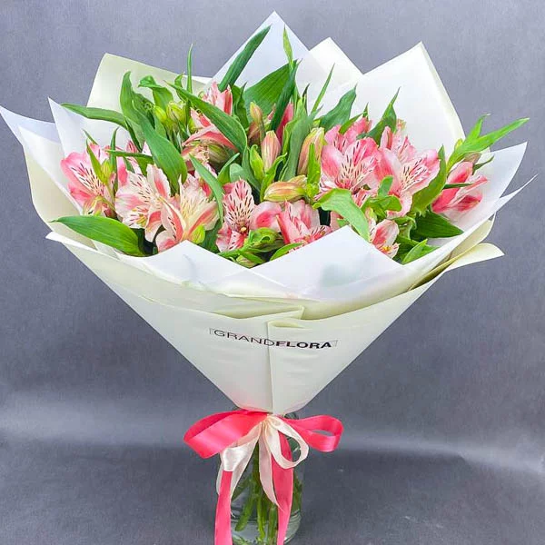 Букет состоит из альстромерии, которую еще называют перуанской лилией из-за внешнего сходства, разнообразное цветовое сочетание, в окружении декоративной зелени. Диаметр букета от 25см до 50см, в зависимости от выбранного варианты букета.  Букет перевязан изящным розовым бантом. Обращаем Ваше внимание, что состав и оформление букета может отличаться.